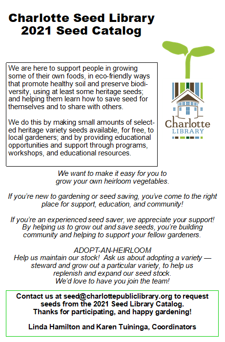 Heirloom variety seeds offered this year by the Seed Library are listed in our 2021 Seed Catalog, along with tips on saving seeds from them. The 2021 Catalog is available right here, and paper copies are in the Library foyer. Request seeds from the Catalog by emailing us at Seed@charlottepubliclibrary.org and we will arrange contact-less pick-up in the Library foyer.
